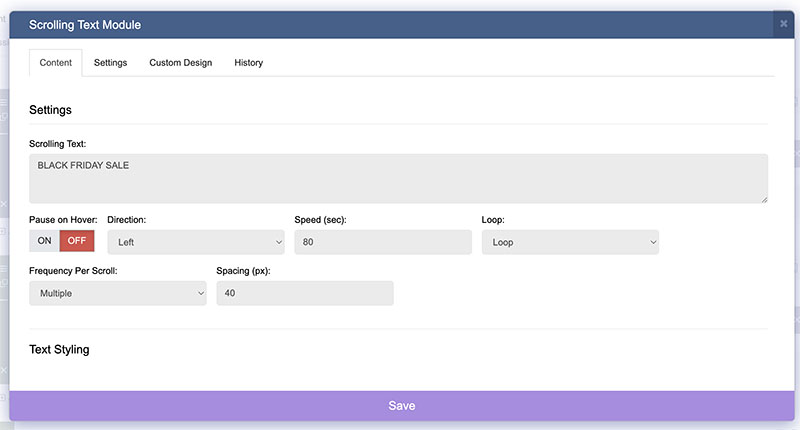 Insert the module into your layout and then open it to configure with your message and custom design. Scroll your text horizontally or vertically, adjust speed, and text style. With a little creative thinking, the options can be limitless.