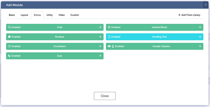 Add movement to your site using the Scrolling Text module. With a little creativity, the effect can be unique and modern, or glitchy and retro. The Scrolling Text module can be found in the Extras tab of the modules pop-up. See highlighted module below.